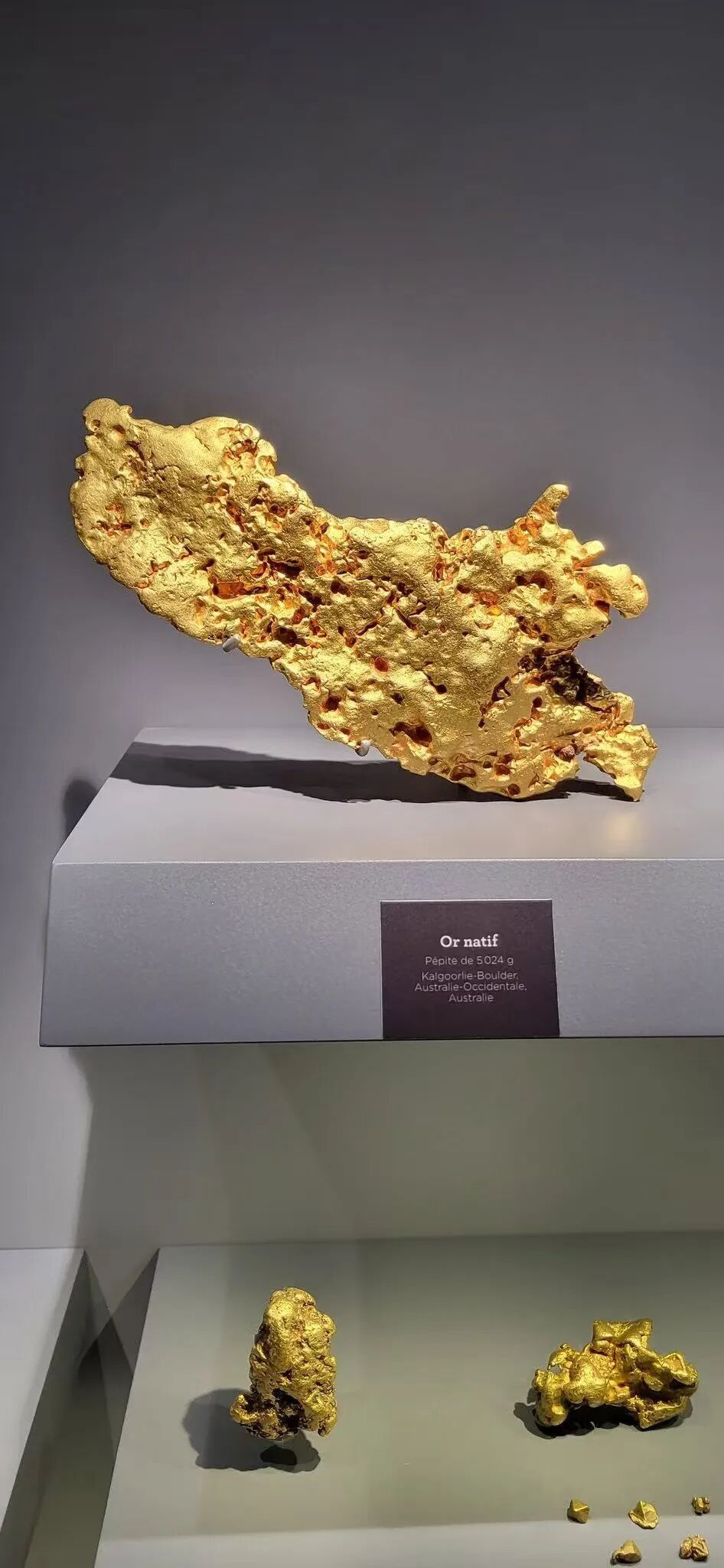 这些黄金不仅本身就是贵金属,还具有重要的历史和科研价值,包括加利福尼亚淘金热时期的标本、18世纪由玻利维亚捐赠给法国科学院的金块、1833年由俄国沙皇尼古拉一世赠予博物馆的乌拉尔金块,以及一块1990年在澳洲发现的重量超过5公斤的金块。
